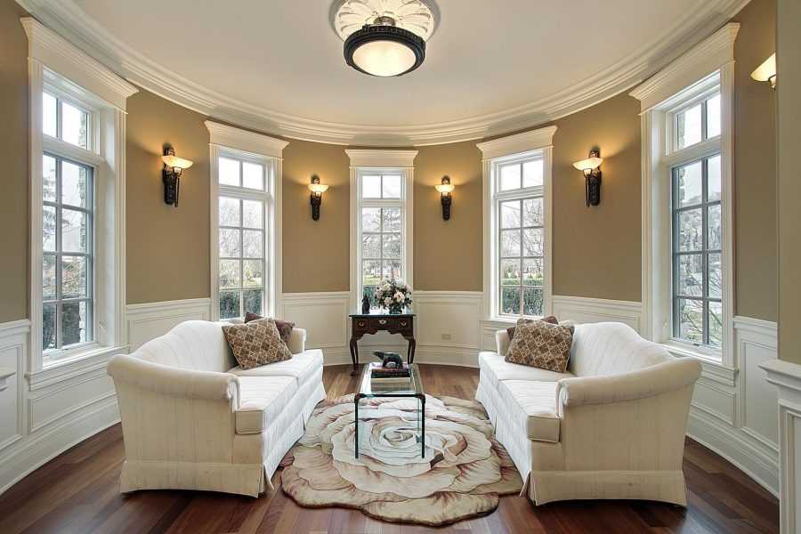 Совет! Цветовое оформление зала должно сочетаться с напольным покрытием, потолком, мебелью и текстилем.