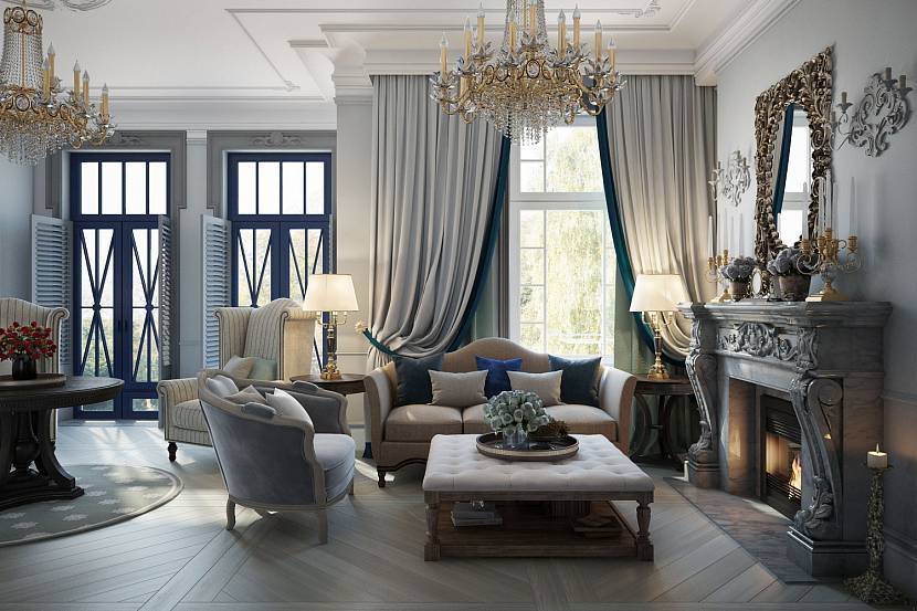 Синяя гостиная в классическом стиле