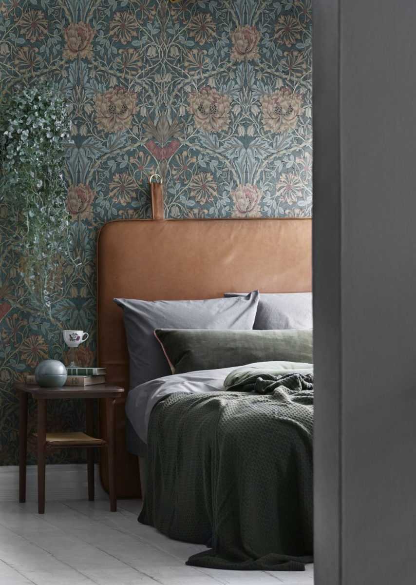 - Отлично освежить пространство в спальне можно с помощью комбинирования белого покрытия и узора из зеленой листвы. Чаще всего такое сочетание используется в интерьерах, оформленных в скандинавском или экостиле.