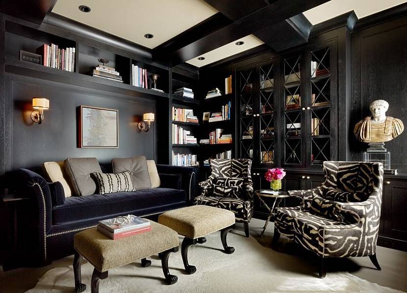 Кроме черных стен часто в интерьере присутствуют и другие затемненные объекты: