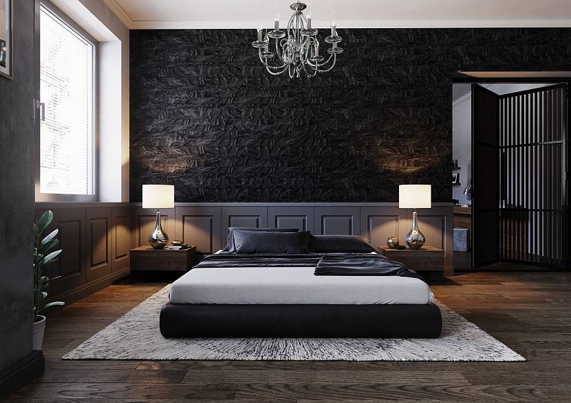 Черная рельефная стена в спальной комнатеИсточник 3ddd.ru