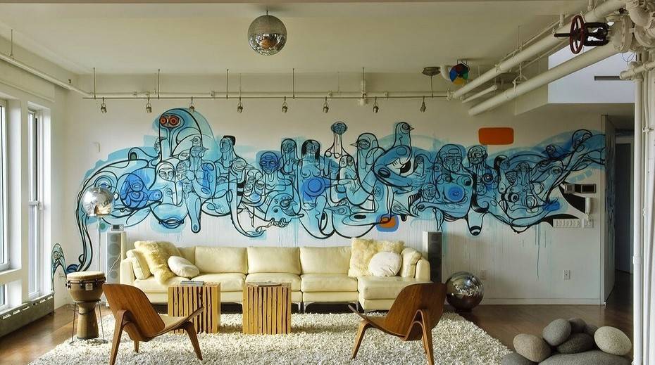 В дизайн интерьера граффити просочилось не так давно. Сначала надписями и рисунками стали украшать тематические заведения: кафе и бары. Затем первопроходцы среди дизайнеров, которые не боялись рисковать, стали комбинировать стрит-арт с гибкими к современным решениями стилями. К ним можно отнести лофт, хай-тек, поп-арт, футуризм, авангард, фьюжн и даже минимализм. В квартирах стрит-арт заменил скучные фотообои. Эффектнее всего смотрятся уличные рисунки в современных студиях, где обычно имеются высокие стены.