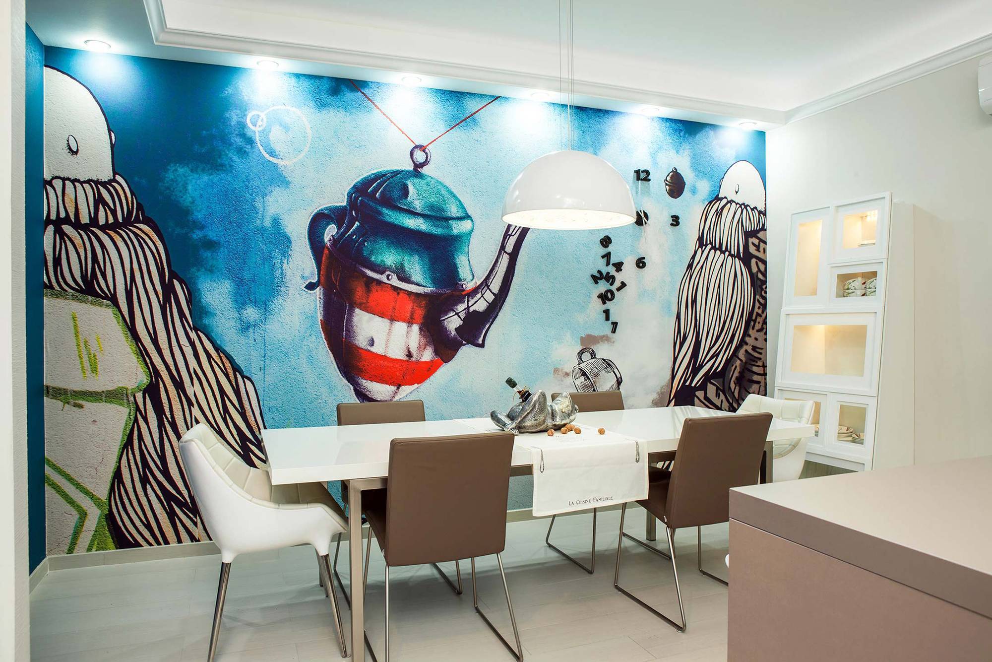 Граффити обычно используют в квартире в стиле лофт, где кухня совмещена с гостиной. Изображение может начинаться на одной стене и заканчиваться рваными краями на другой. На кухне уместны рисунки в стиле кубизм, они как нельзя лучше гармонируют со шкафчиками и бытовой техникой. Декорировать с помощью граффити можно стену в обеденной зоне, фартук или потолок. Визуально расширить помещение поможет изображение окна или перспективы.