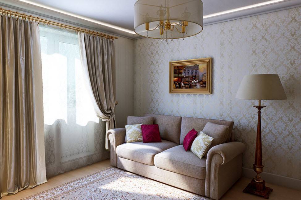 - для зала прямоугольной или узкой формы используйте сочетания теплых и холодных оттенков или вертикального и чередующегося принта;