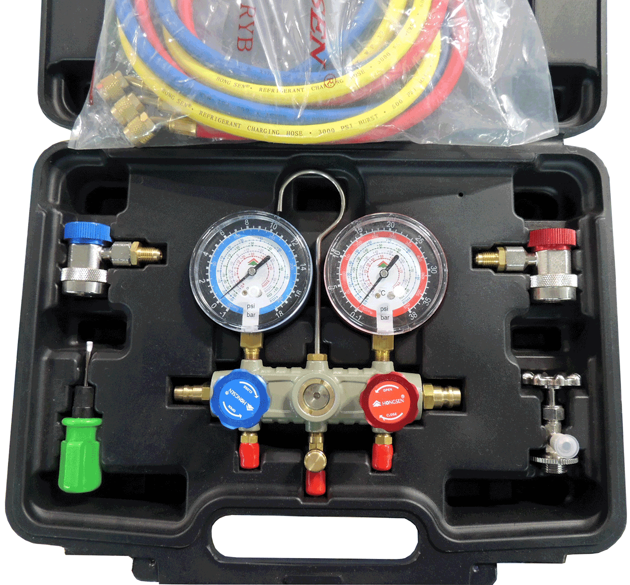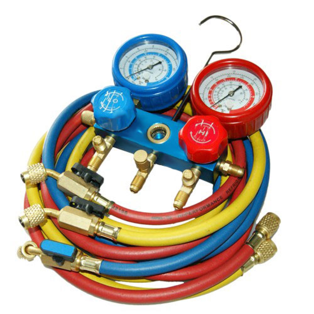 Комплект оборудования для заправки кондиционеров позволяет сэкономить на оплате услуг представителя сервиса и выполнить работу самостоятельно. Ручная станция позволяет осуществить диагностику сплит-системы и заполнить контур хладагентом. Автоматические и полуавтоматические станки для заправки кондиционеров автомобилей отличаются высокой стоимостью и используются в коммерческих целях. Бытовые и полупромышленные климатические системы обслуживаются с применением стандартного переносного комплекта. В его составе: