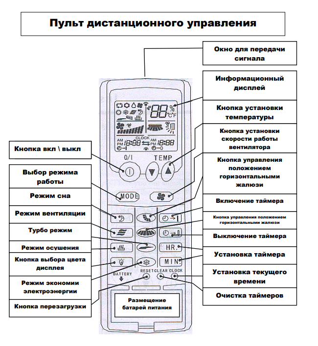 К подавляющей части выпускаемых кондиционеров в комплекте идут пульты дистанционного управления. На таких пультах расположены дисплей и панель управления кондиционером. Дисплей может показывать температуру воздуха вокруг кондиционера, влажность и другие параметры. Панель управления может выглядеть по-разному. Она может представлять собой единственную кнопку, поделенная на активные части, или россыпь кнопок, отвечающих за собственный алгоритм действий. Так или иначе, все податливые части пульта обозначены надписью или, возможно, понятным рисунком.