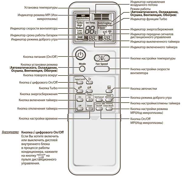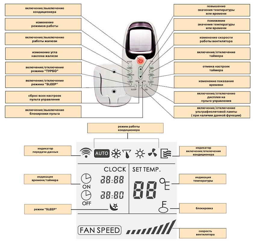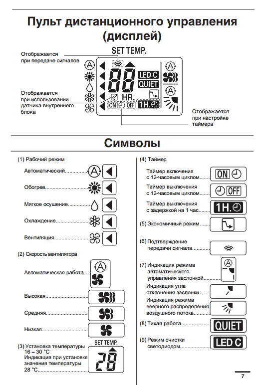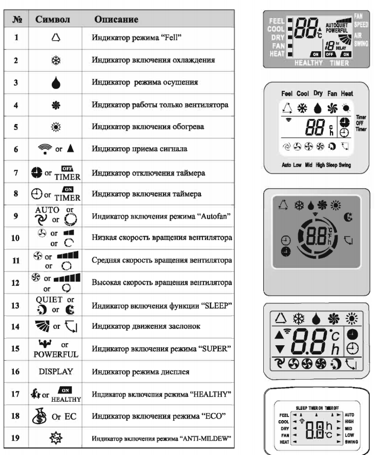 На пульте управления есть определенные значки, обозначающие режимы кондиционера.