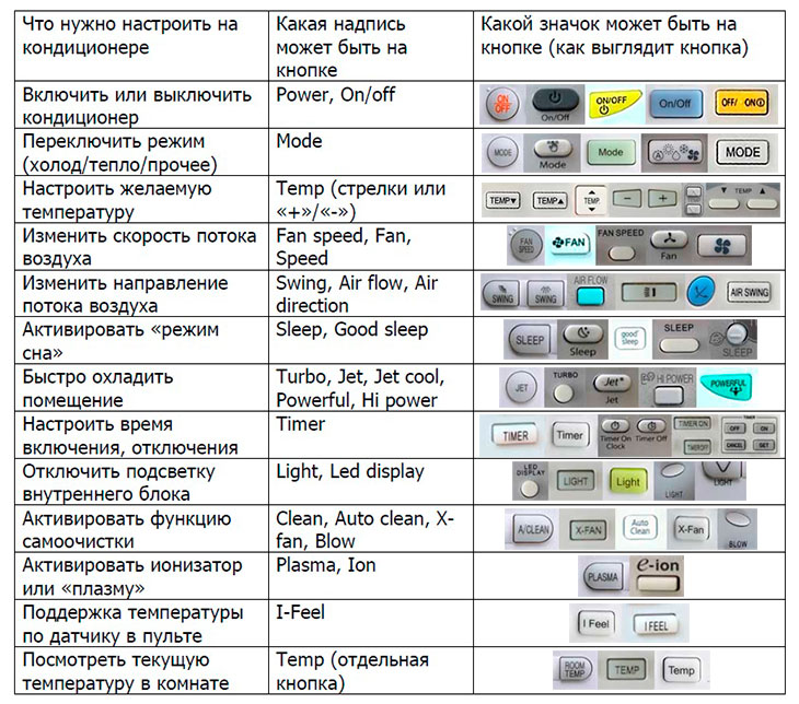 В каждом кондиционере присутствуют основные режимы и дополнительные,которые напрямую зависят от производителя и модели устройства. Обозначение значков на пульте кондиционера: