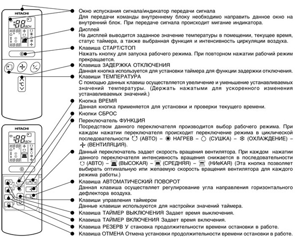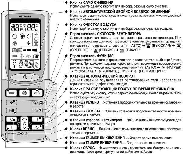 На этой схеме пульта дистанционного управления от кондиционера HITACHI хорошо видны пиктограммы в виде солнышка, снежинки и капельки
