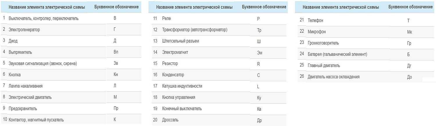 Буквами на электросхемах и чертежах маркируют радиоэлементы, электронные детали, интегральные микросхемы, электродвигатели и прочее. Примерный перечень буквенной маркировки представлен нижеследующим списком.