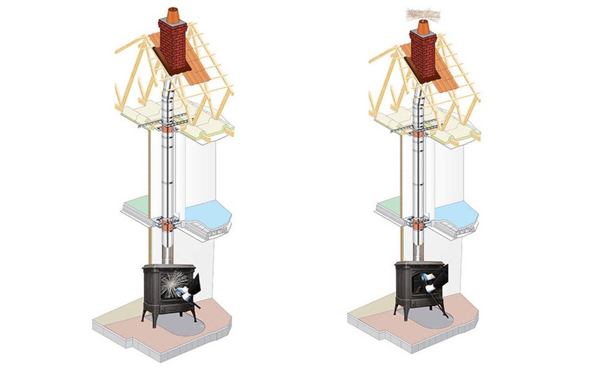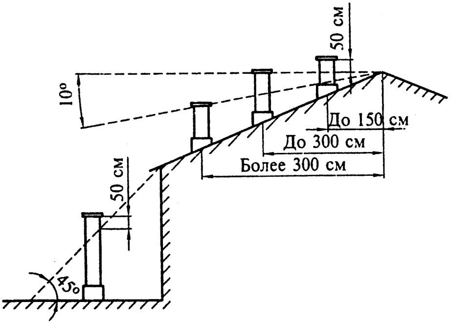 - особенности конструкции (наличие горизонтальных или наклонных участков) расположение оголовка трубы относительно конька крыши;