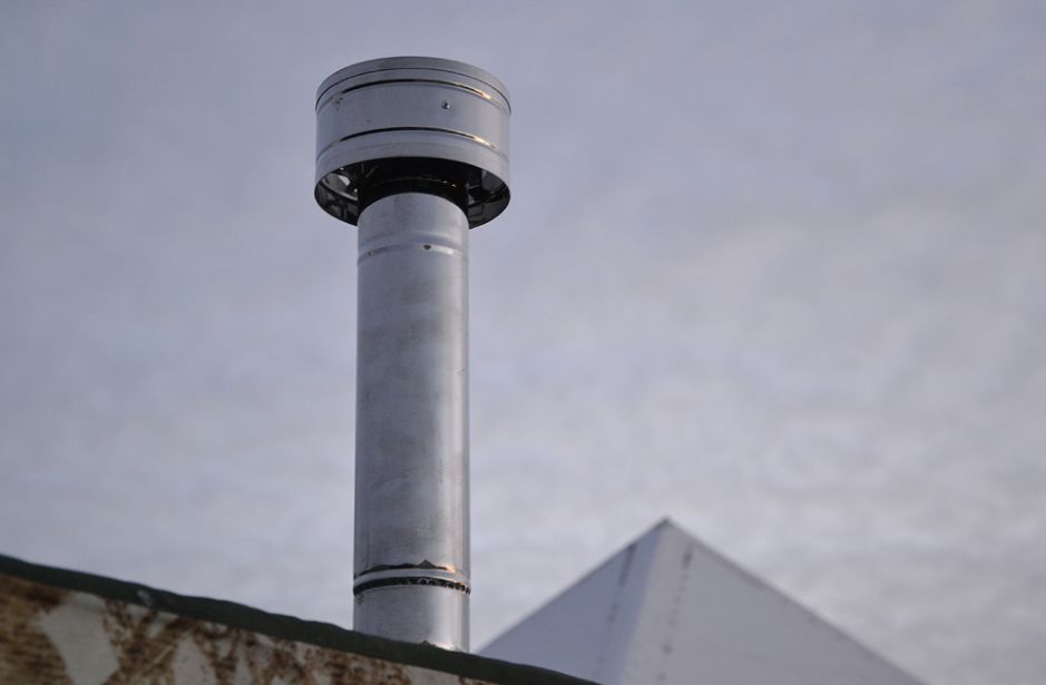 - Неправильное размещение трубы. Труба должна возвышаться выше плоской кровли минимум на 0,5 метра. Расстояние между коньком и трубой должно составлять 1 метр. Длинна рукава в сумме должна составлять минимум 5 метров.