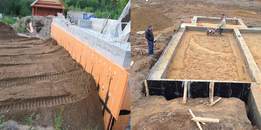 Если засыпается фундаментная лента глубокого заложения, на отместке 30 – 40 см от поверхности нужно уложить горизонтальную теплоизоляцию (5 см листы экструдированного пенополистирола высокой плотности), после чего, продолжить работы.