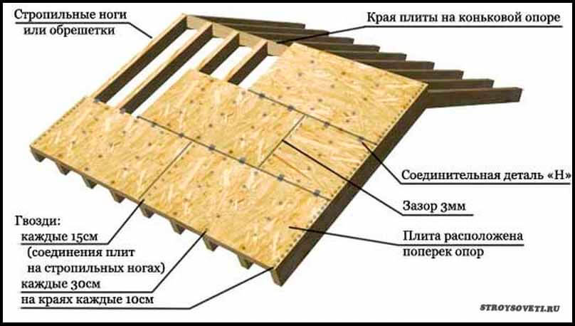 - Листы ОСП-3 или фанеры размещают вдоль конька, длинной стороной поперек стропил. Монтаж ведут с разбивкой швов, то есть в шахматном порядке. Между щитами оставляют компенсационный зазор 2-3 мм. Крепление выполняют на каждой стропилине, используя для фиксации саморезы или ершеные гвозди. Шаг креплений на стропилах – 30 см. Укладывают плиты так, чтобы их кромки обязательно пришлись на опоры, там же выполняют их стыковку и тоже фиксируют элементами крепления, но уже с более частым шагом – 15 см.