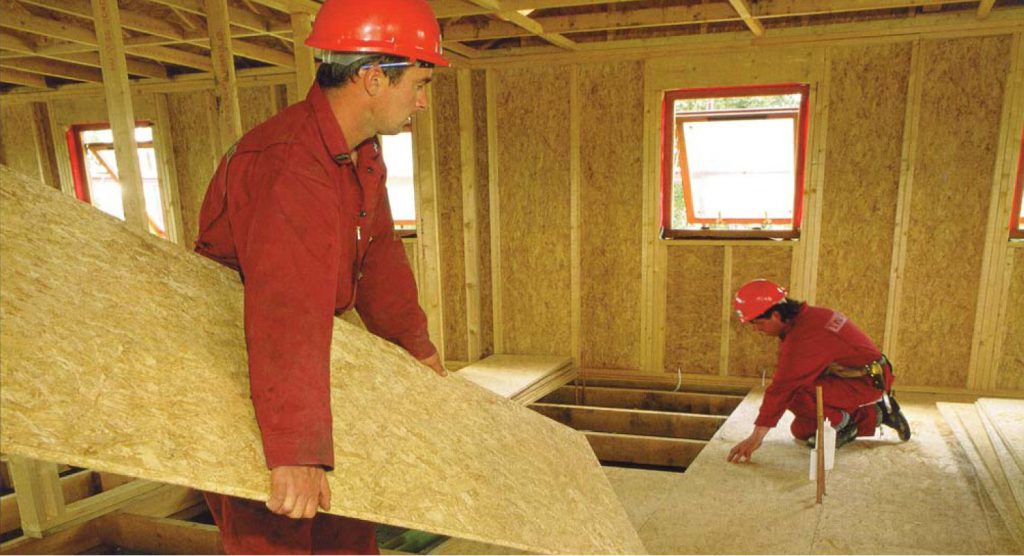 Следующим слоем укладывается слой из досок под 45-градусным углом. Между ними, как и при устройстве однослойной конструкции из штучных элементов, устраивается стабилизирующий зазор в 3 мм. Помимо досок можно применять фанеру или листы ОСП, с укладкой слоя утеплителя (для теплого чердака) или без него.