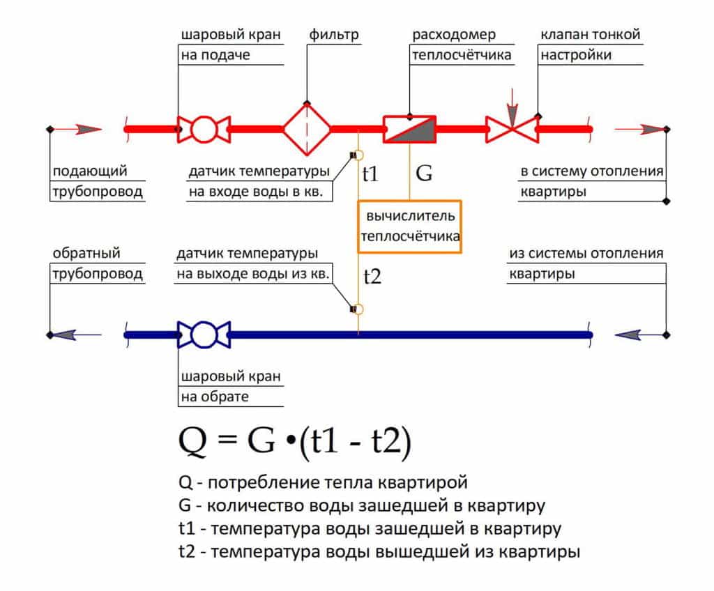 Общедомовой прибор учета устанавливается на подающую магистральную линию, проходящую в подвальном помещении. После счетчика тепло подается по квартирам.