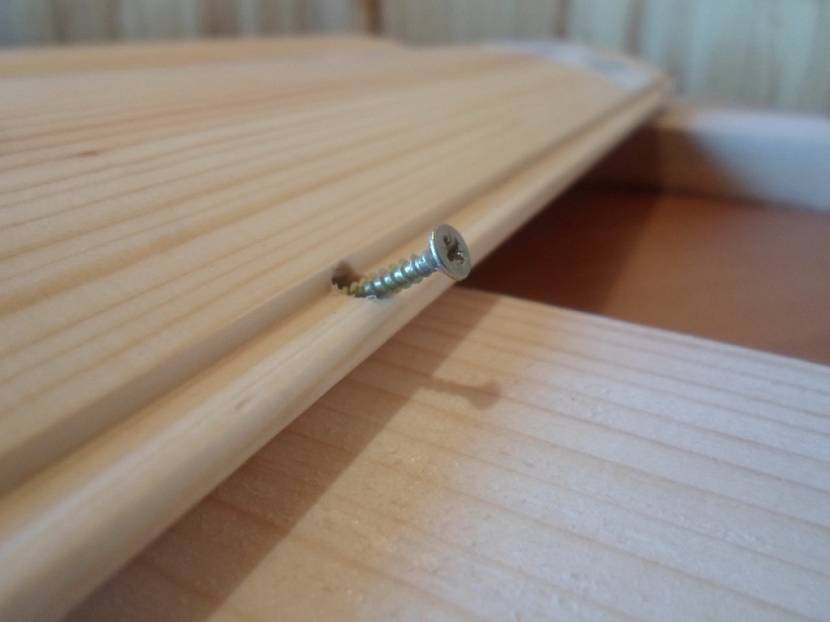 Данный способ крепления является самым популярным и надежным. Чтобы установить блок-хаус таким образом, в нижней части доски необходимо сделать отверстие до половины толщины панели. Затем в него вставляют саморез и утапливают его в доску вместе со шляпкой. Скрыть место крепежа можно декоративной пробкой или шпаклевкой из опилок и клея.