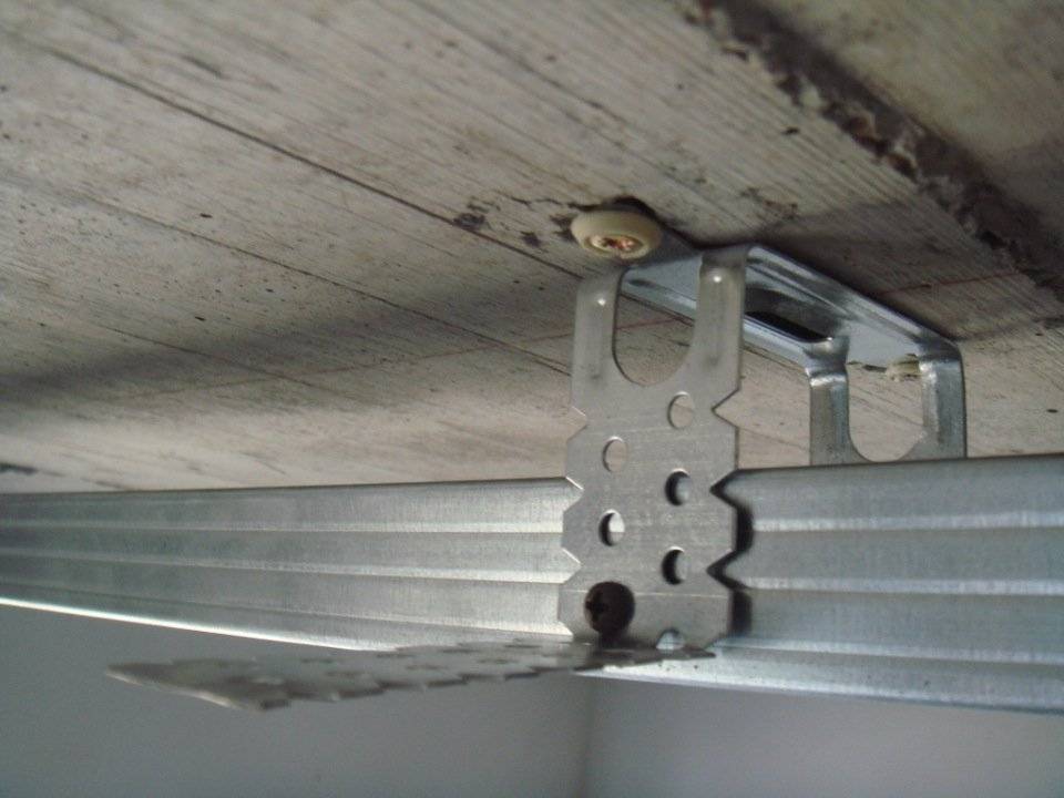 При кажущейся простоте работы, монтаж идеального каркаса из деревянных брусьев усложняется из-за, имеющихся в них дефектов. Легче всего возвести каркас из металлопрофиля для гипсокартонных листов. Кроме того, если, основа потолочной поверхности бетонная, то предпочтительнее использовать именно металлопрофиль. Выбирается он хорошего качества с толщиной железа не менее 0,4 мм.