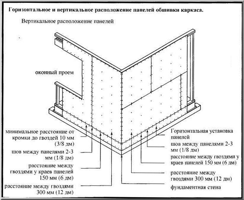 - При использовании деталей толщиной 9 мм на одноэтажном доме размещение производится горизонтально. Для более высоких построек плиты толщиной 12 мм располагаются вертикально. Многие специалисты отмечают, что первый вариант обеспечивает лучшую надежность за счет большего количества стоек. Учитывается, что в этом случае плиты располагаются вразбежку.