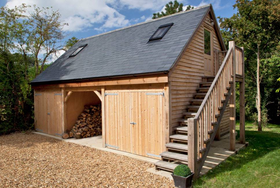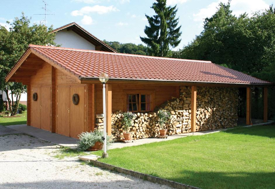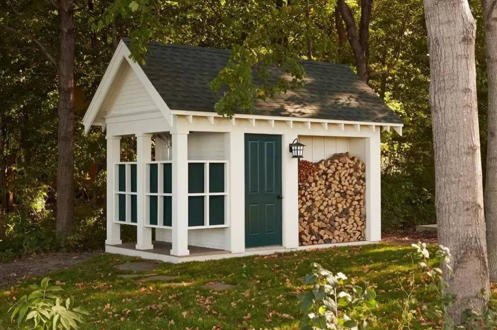Многие дачники решают обустроить хозяйственные блоки уголками для принятия водных процедур. Нередко на участках можно повстречать хозблоки, которые построены вкупе с вместительным дровяником, где хранится необходимое сырье для разведения костра, а также работы камина или печей.