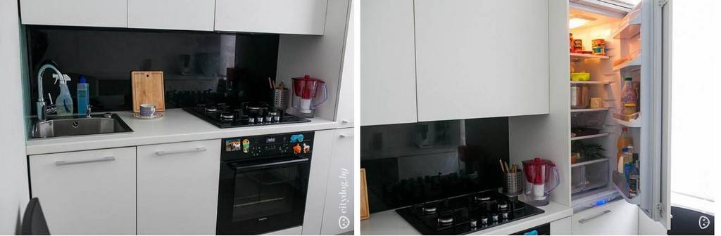 Холодильник, пенал, духовой шкаф или стиральную машину там разместить не получится, дверцы не откроются. Разместить по диагонали — теряется полезная площадь. Установить варочную панель — неудобно работать с «дальними» конфорками.