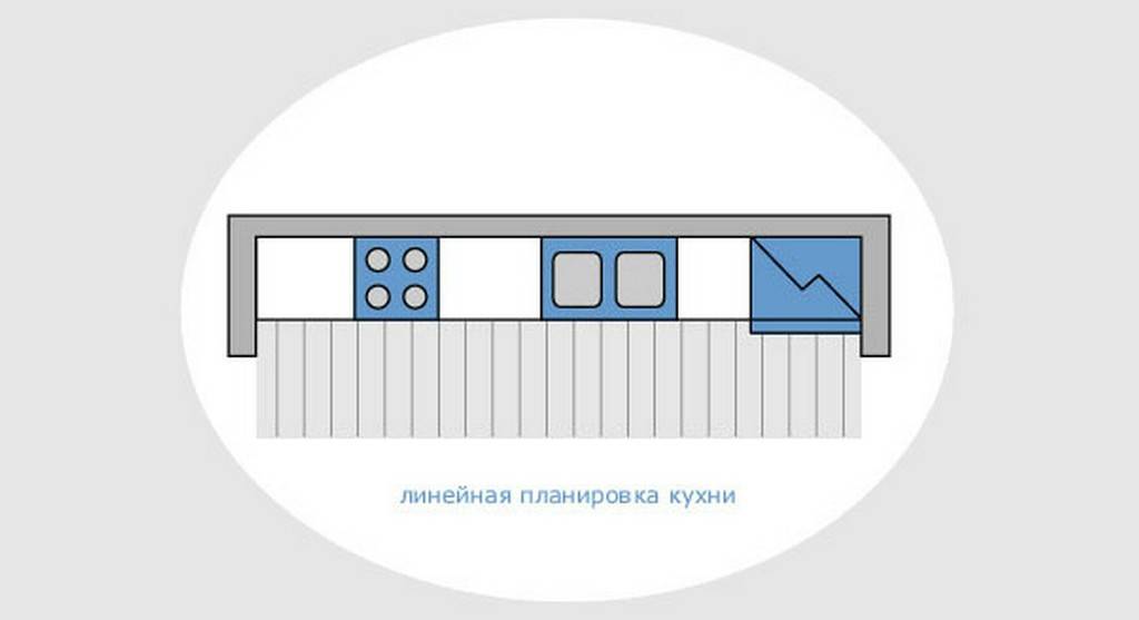 Линейная планировка не позволяет создать идеальный рабочий треугольник, так как вся мебель и техника выстроены в одну линию. Равноудаленно расположить плиту, холодильник и мойку может помешать газовый стояк или водопроводные коммуникации.