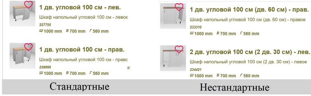 У разных производителей стандартные размеры угловых модулей гарнитура могут незначительно отличаться. Крупные компании предлагают готовые угловые модули нестандартных размеров. Например, в Леруа Мерлен можно спроектировать гарнитур с Г-образным модулем следующих размеров.