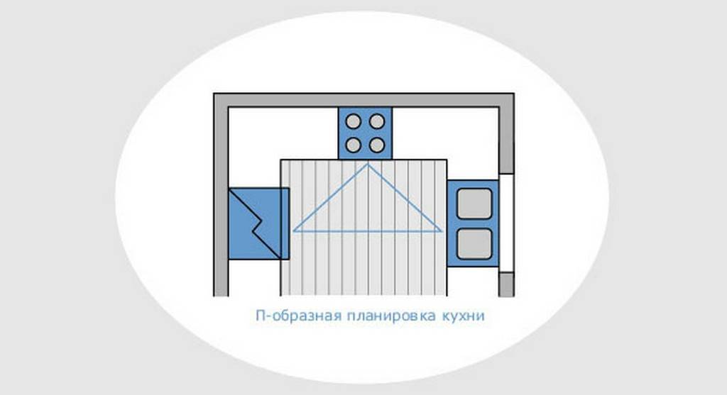 Удобная горизонтальная компоновка модулей сохранит силы и время во время готовки. В каждом варианте планировки (линейная, угловая, П-образная, островная) есть своя схема организации рабочего треугольника.