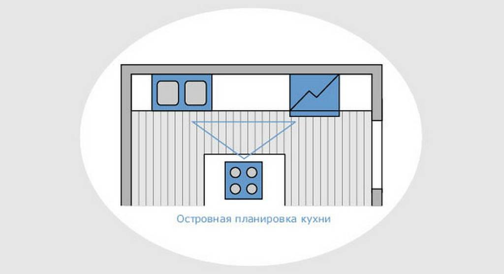 Островная планировка подходит лишь для просторных помещений, так как требует, как минимум, по 80-90 см свободного места по обеим сторонам от острова в проходах.