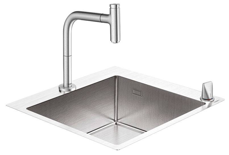 Hansgrohe C71-F450-06 43201000 – система “2 в 1” за 84 400 рублей. Вам не придется проделывать отверстия и подбирать подходящий кран: она продается уже со смесителем. Собственно, основная прелесть этой модели и состоит в его особенностях. Выдвижной излив, два типа струи, кнопка Select для быстрого включения/выключения потока – все это уже имеется в базовой комплектации.
