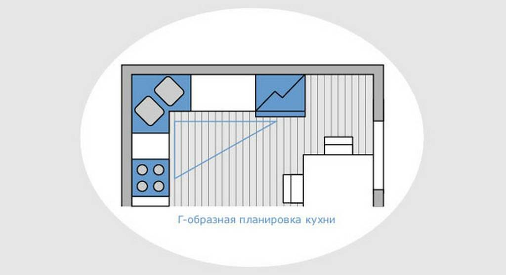 Г-образная планировка – самая удобная. Идеальный вариант для создания правильного рабочего треугольника.