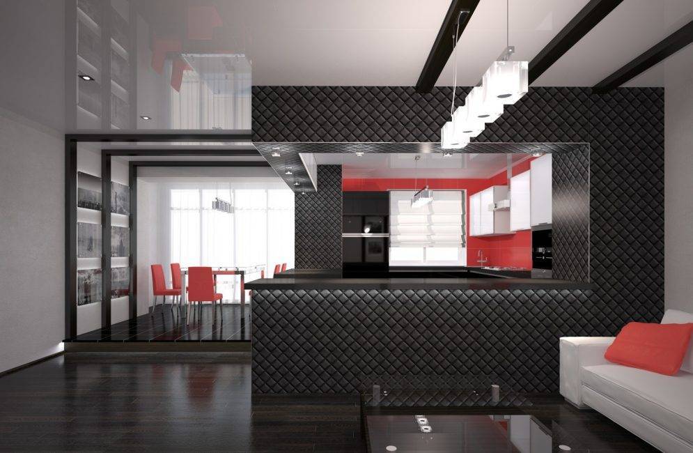 Также определенные участки отделяют с помощью штор, балдахинов, мебельных предметов или используют разную конфигурацию и фактуру потолка, например, в виде глянцевого и матового натяжного полотна. Не менее популярным является разграничение пространства освещением, разнотипной стеновой отделкой или перепадом уровня пола.