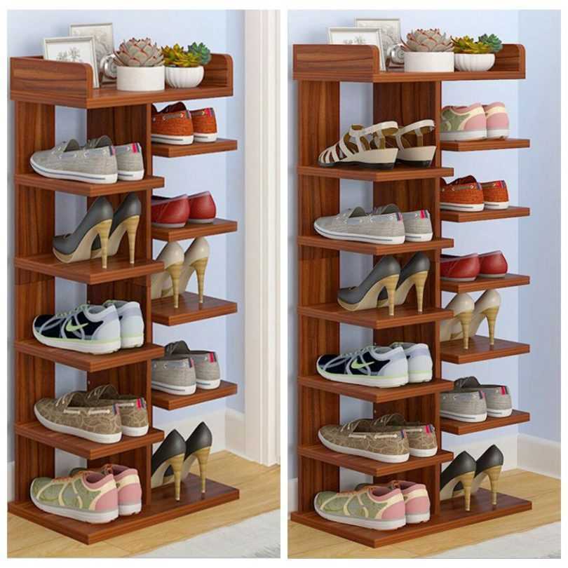 Можно разместить вдоль всей стены, размер полок любой, но недостатком такой обувницы является неустойчивость.