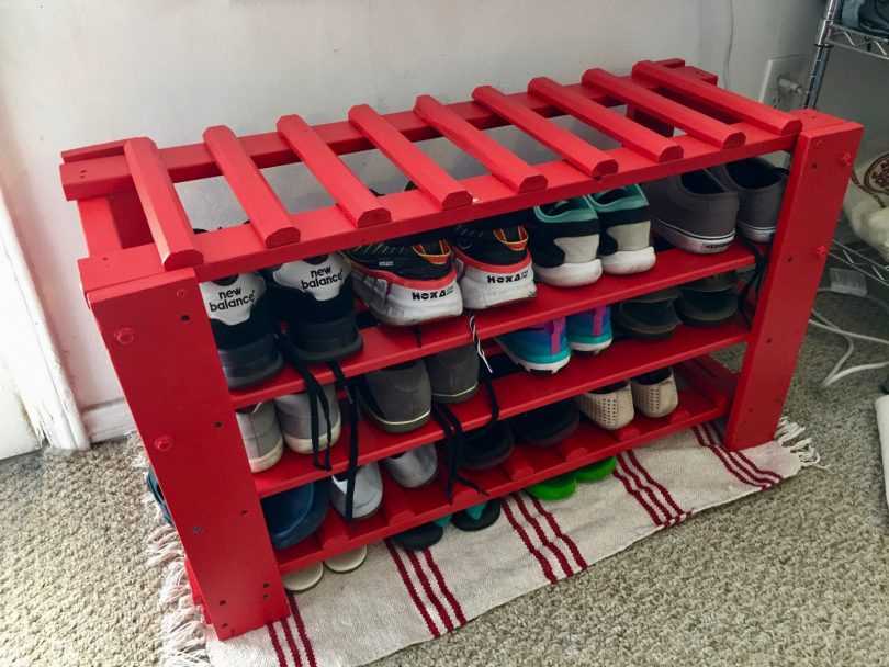 В узких местах, таких как входной уголок, эта стойка для обуви, которую также можно сделать самостоятельно, обеспечивает компактное, но эффективное решение для хранения обуви любого типа – от легких кроссовок до громоздких сапогов.