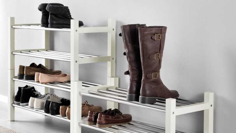Во всех этих разновидностях могут быть разные полки.Привычные сплошные — пластмассовые, ДСП, МДФ — не слишком удобны. На них скапливается пыль и грязь, они затрудняют движение воздуха, из-за чего обувь хуже сохнет. Лучший вариант — из металлической проволоки или нескольких труб/штырей, на которые ставится обувь.