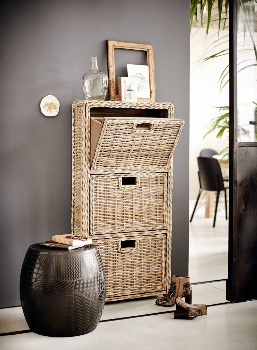 - Обувница из ротанга — красивое, изящное плетеное изделие, очень популярное, несмотря на дороговизну материала. Шкаф выполняется из натурального сырья или его качественного искусственного заменителя. Мебель подчеркнет индивидуальность и самобытность интерьера, она достаточно прочная и долговечная, но требует грамотного ухода.
