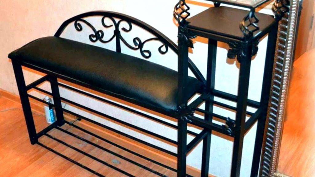 Металл используется при изготовлении открытых конструкций, сетчатых элементов, опорных стоек. Это самый универсальный материал. Шикарно смотрится кованая полка для обуви в прихожую, она не только функциональна, но и служит декоративным украшением;