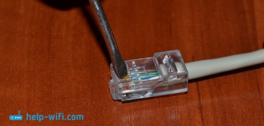Еще раз проверяем, правильно ли вошла витая пара в разъем и приступаем к обжимке. Берем нашу отвертку (может у вас еще что-то) и по очереди прижимаем контакты. Смотрите внимательно, руку не повредите!