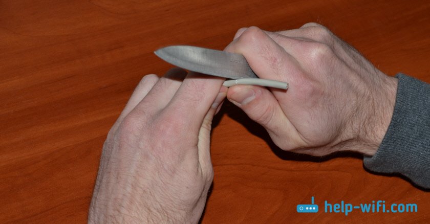 Ровно обрезаем кабель нужной длины. Отступаем примерно 2 см от среза и аккуратно канцелярским ножом срезаем изоляцию. Следите за тем, чтобы не повредить жилы.