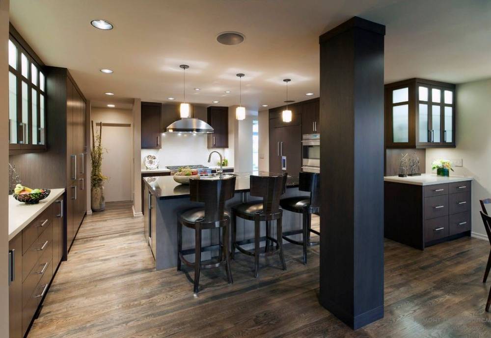 Все зависит от того хотите вы использовать контрастный дизайн или нет. Для приверженцев спокойной атмосферы будет удачным сочетание с бежевыми стенами, белым потолком и темным полом. Материал отделки и материал фасадов не должны отличаться друг от друга более чем на 5 тонов. Иначе поверхность будет выглядеть кричаще на остальном фоне.