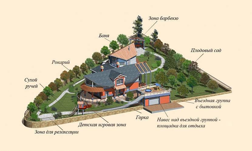 Планировка загородного участка неправильной формы с барбекю зонойИсточник stoyer.ru