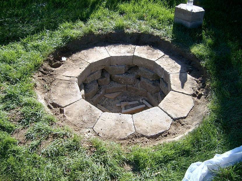 Дальше все зависит от наличия материалов, вашего желания и вкуса. Стенки ямы можно отделать и укрепить по-разному: кирпичной или каменной кладкой на жаропрочном растворе, простой укладкой кирпича по периметру, как на фото, вставкой из листовой стали. Используя стальной кожух, его нужно сделать чуть меньше диаметра котлована, а пространство между ним и стенками засыпать гравием.