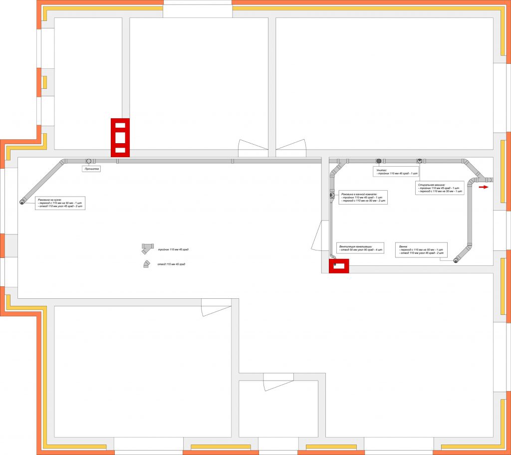 Например, можно провести вентиляционную трубу внутри вентиляционного канала ванной комнаты. Трубы дымохода устанавливаются над крышей – так они будут выходить на улицу с разных точек. Ни в коем случае не выводите вытяжную часть канализационных стоков в вентиляционный канал, т.к. это запрещено.