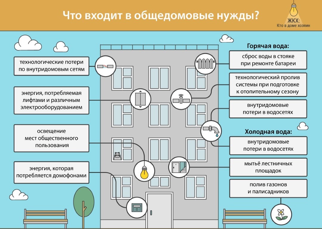 Электрические лампы, которые освещают перечисленное выше общедомовое имущество, и сопутствующая коммуникация потребляют определенный объем электричества. Уплата за ОДН разделяется между всеми собственниками квартир в многоэтажке.