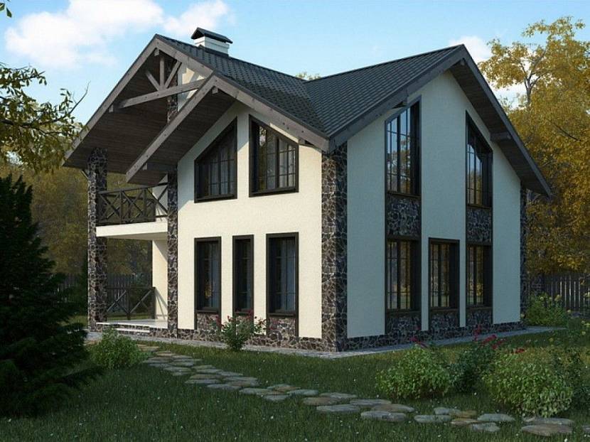 Одно из оптимальных решений для семьи из 3-4 человек. Коттедж отличается простым и аккуратным внешним видом, несложной конфигурацией. Опорами для балконов служат бетонные столбы (по 3 шт. на каждый). На балконах сделано фигурное деревянное ограждение. Оригинальности вешнему виду коттеджа придают разные по размерам прямоугольные окна (двухстворчатые и одностворчатые). Крыша четырехскатная. Фасад – декоративная штукатурка, кровельный материал – металлочерепица, цокольная часть – имитация камня. На 2-й этаж ведет удобная маршевая деревянная лестница.