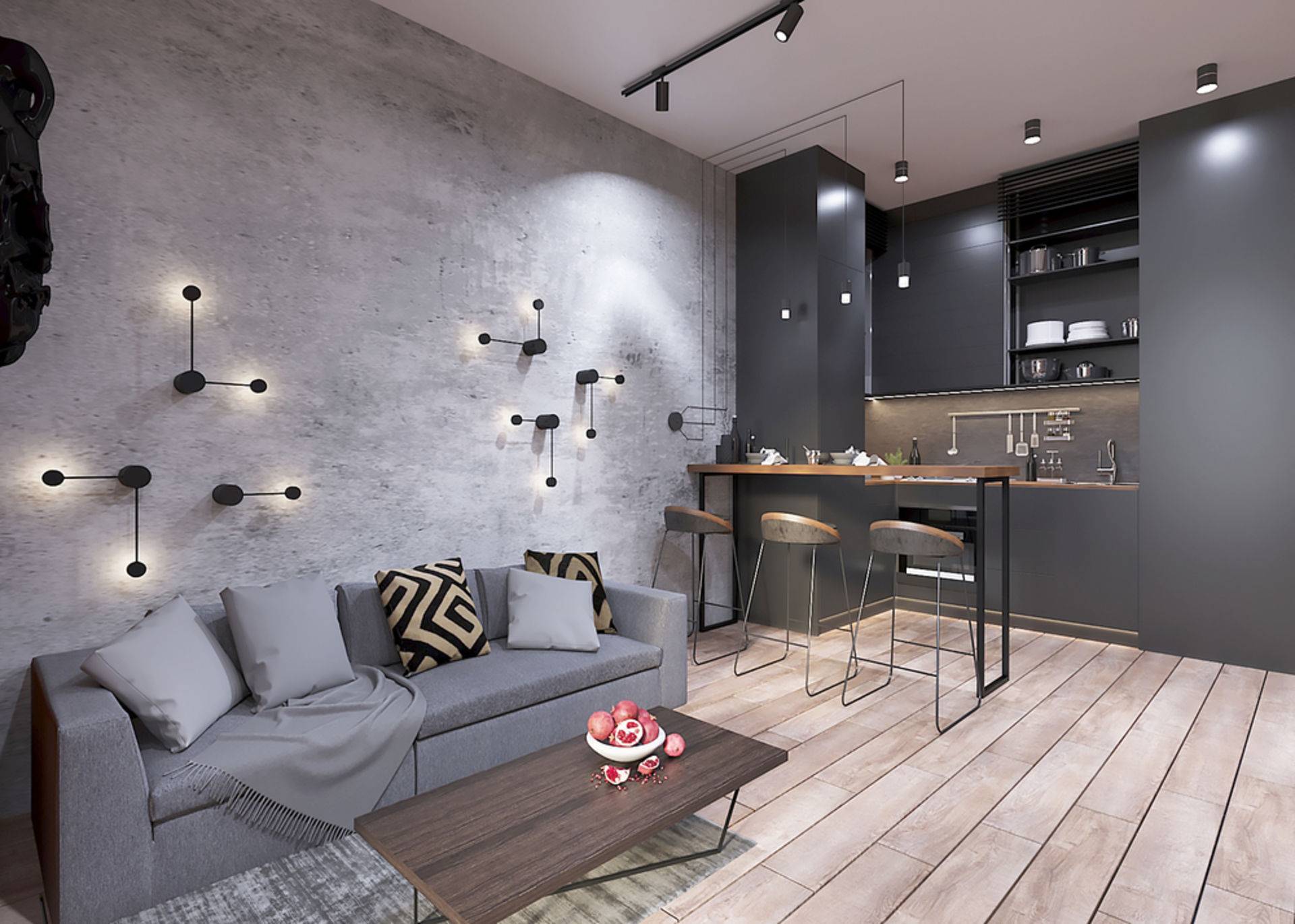 Все стены часто выполняются в одной цветовой гамме. Если вы хотите поэкспериментировать с отделкой поверхностей, то лучше выбрать в качестве акцента пол или потолки. Больше всего в квартире должно присутствовать серых тонов