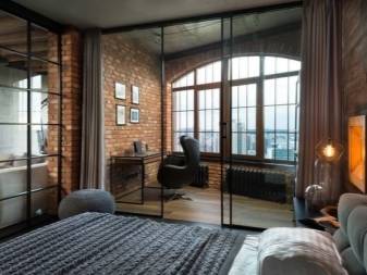 Шкаф или гардеробная – обязательная деталь интерьера. Для них лучше ставить раздвижные двери по принципу купе, экономящие пространство. Также шкафы могут иметь двери других форматов (гармошкой, распашные, радиусные) или стоять открытыми. Стиль лофт в интерьере допускает установку открытых систем хранения. Но только жильцы должны быть аккуратными и не бросать вещи на полках хаотично: интерьер будет выглядеть неопрятно.
