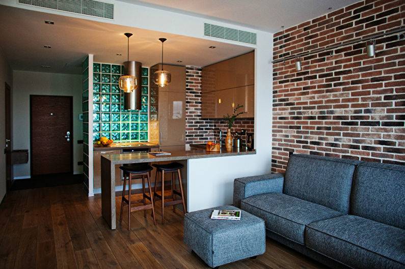 Приведем пример одного из вариантов оформления стиля лофт в однокомнатной квартире: