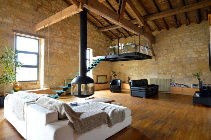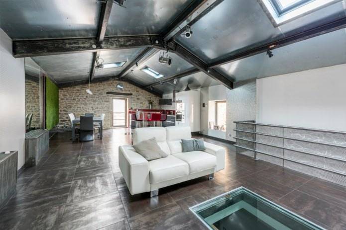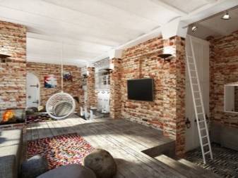 - В облицовке присутствуют более грубые и необработанные материалы, в виде бетона, кирпича или неровно нанесенной штукатурки, подчеркивающей первозданный вид чердачного помещения.