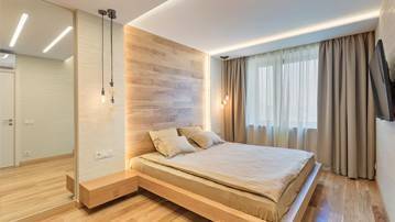 - Высокие потолки светлых оттенков и открытая планировка с почти полным отсутствием перегородок. Например, квартира-студия, в которой зонирование выполняется путем использования разных цветовых решений, освещения или полупрозрачных перегородок.
